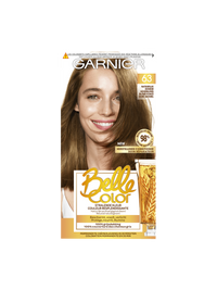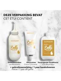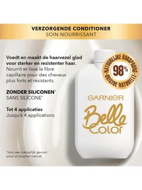 Le secret d'une couleur naturelle et éclatante. Grâce à sa formule unique enrichie en huile de germe de blé, Garnier Belle Color protège vos cheveux pendant la coloration et renforce les contrastes naturels de vos cheveux. Il offre une couverture des cheveux blancs à 100% sans effet casque. Un blond doré facile à porter, riche en brillance et toujours naturel et éclatant. L'emballage contient les composants suivants : 1 flacon applicateur avec crème révélatrice, 1 tube de crème colorante, 1 flacon de revitalisant réparateur, un mode d'emploi et une paire de gants.