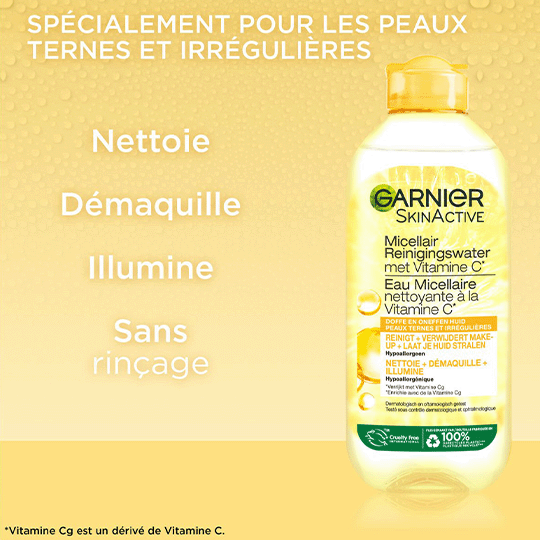 Vous n'avez pas besoin d'utiliser dix produits de soin pour avoir une peau éclatante. Notre eau Eau Micellaire Nettoyante à la Vitamine C donne un coup de fouet instantané à votre peau. Il élimine le maquillage, les impuretés et aide votre peau à retrouver son éclat.
