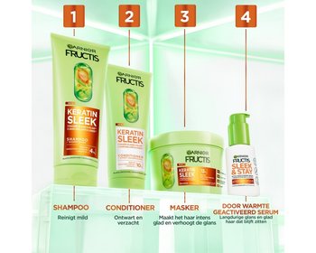 De nieuwe Keratin Sleek routine van Garnier Fructis transformeert pluizig en droog haar direct. Onze formule met keratine gladmakend complex+arganolie maakt de haarvezel onmiddellijk glad. Het resultaat? Een complete transformatie met een ultieme glans die langdurig aanhoudt.