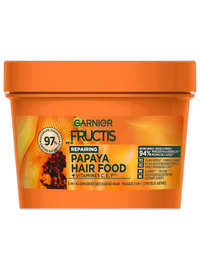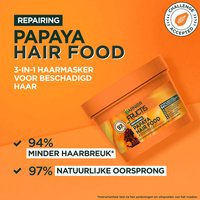 Het 3-in-1 Garnier Fructis Hair Food Papaya haarmasker met een nieuwe formule geboost met vitamine C*, E en F*, speciaal voor beschadigd haar. Voor 94% minder haarbreuk** en om het haar snel te herstellen, zonder het te verzwaren!