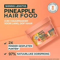 Het 3-in-1 Garnier Fructis Hair Food Pineapple haarmasker met een nieuwe formule geboost met vitamine C*, E en F*, speciaal voor lang en dof haar. Voor 2x minder gespleten punten**, beter doorkambaar en glanzend haar, zonder het te verzwaren.